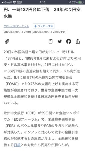 136円を突破 狂ってる。 わずか1ヶ月で10円もの円安。 このペースで行けば 7月末には146円 8月末には156円 9月末には166円… アメリカは年内さらに金利を上げる予定でいるから 2022年末は200円超え なんてことがあるかもしれない。 報道はまるでアメリカが悪…